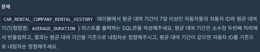 -- 평균 대여 기간에 TO_CHAR를 사용했더니 문자열로 바껴서 정렬에 문제가 생겨서 숫자형식으로 다시 바꿈