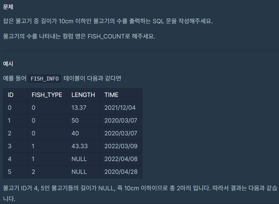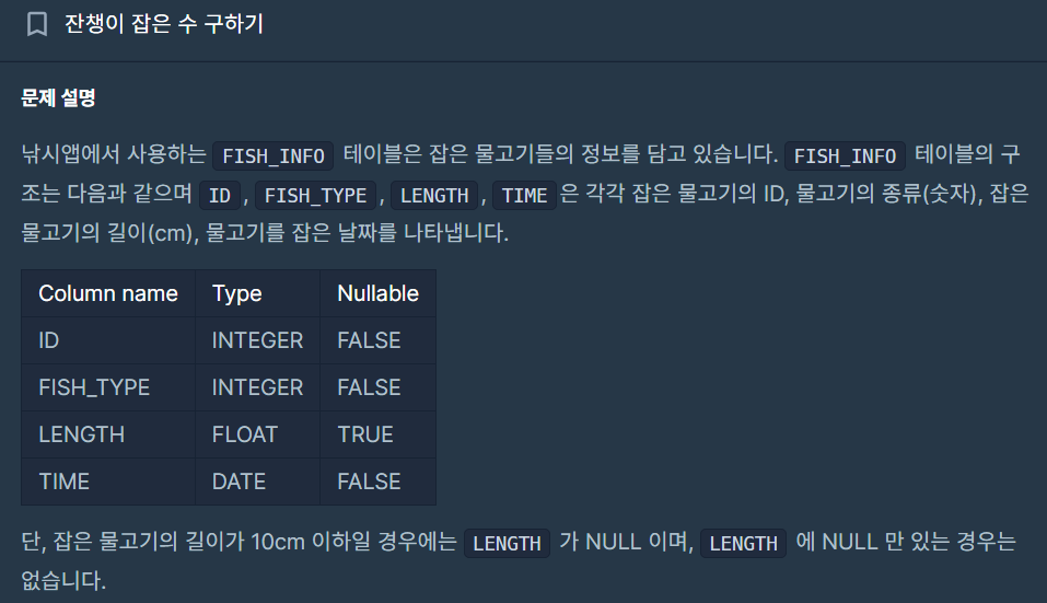 my sql 프로그래머스 레벨1 잔챙이 잡은 수 구하기