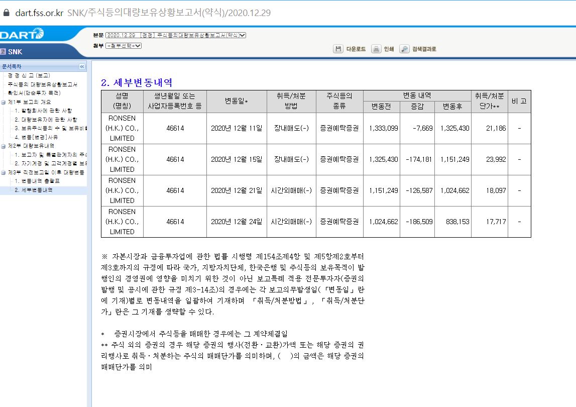 상장주식 회사의 지분 5% 이상을 보유했을 경우 지분을 매각하거나 매입하면 그것을 보고해야 할 의무가 있다. 근데, 12월 24일까지 지분을 팔고 83만 8천주 정도가 남았다고 보고하면서 5% 아래로 지분율이 하락해서 더 이상 보고할 필요가 없게 됐다.