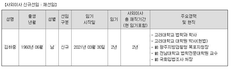 같은시기인 2002~2003년 김하중 사외이사도 광주지방검찰청의 부부장검사로 있었다고 한다. 광주지방검찰청이라는 직장으로 엮인 상황이기는 하나 아직 윤석열 관련 종목으로 주목받고 있지는 않다.
