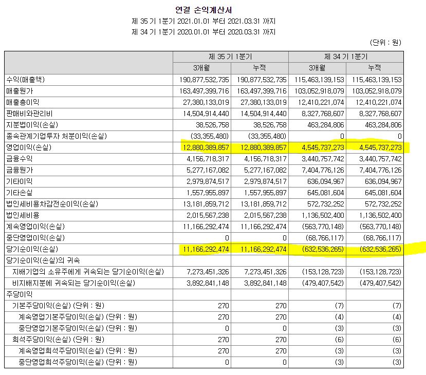 왜 그렇게 됐냐하면 회사 전체적으로 실적이 개선되었다는 게 맞기는 한데, 눈에 띄는 게 몇 개 있다.