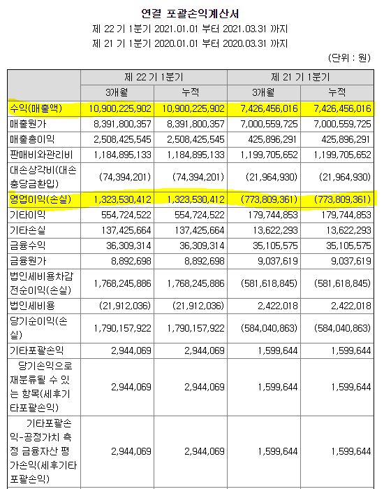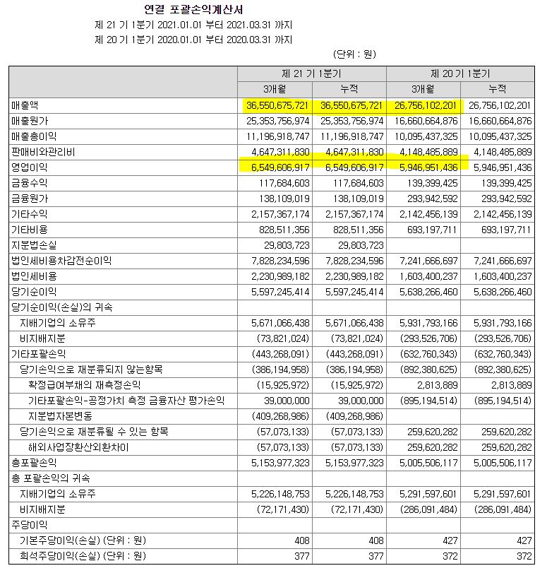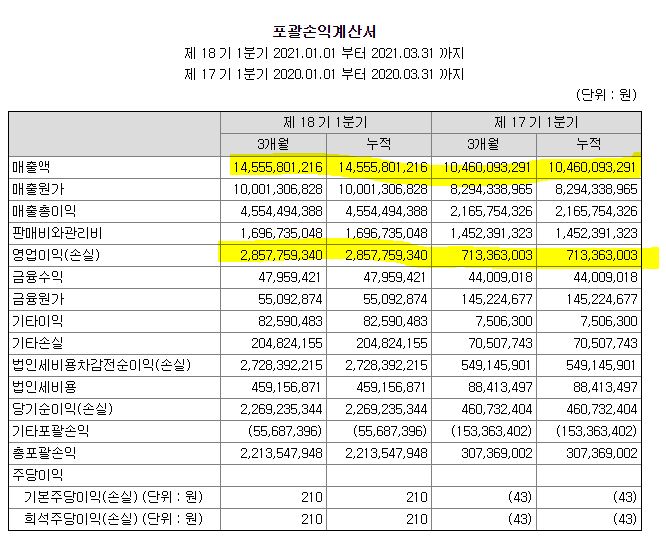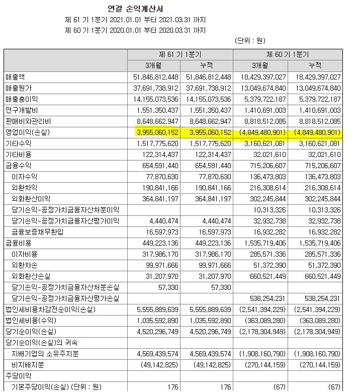 매출액은 대략 40% 정도 나아지기는 했는데, 영업이익은 그만한 레버리지 효과가 나오지는 않았다. 조금 더 지켜봐야 할 것 같다.