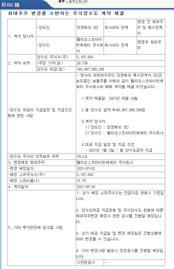 - 2021.05.24 ISC 헬리오스PE로 최대주주 변경