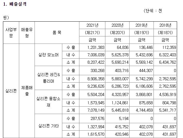 실리콘 레진과 폴리머가 매출액의 거의 대부분이다. 실리콘 레진과 폴리머는 전자 소재, 건설 부문에 사용된다고 한다. 실란 모노머도 비슷하다. 실리콘 융합소재는 수출이 비중이 높은데, 이것도 주로 건설 관련 부문에 사용된다고 한다. 활주로나 다리 건설 등에.