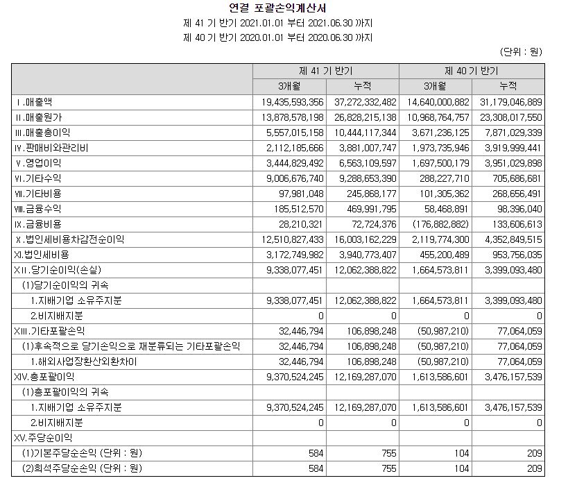 올해 2분기까지 매출액은 372억원, 영업이익 66억원, 당기순이익은 121억원을 기록 중이다. 영업이익이 작년 같은 기간대비 70% 정도 늘어난 상황이다.